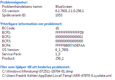 Fick alldeles nyss bluscreen när jag var inne på youtube. Jag har fått samma fel förut men bara när jag har spelat. Och nu när jag startade chrome stod det att inställningsfilen för chrome var skadad och mina inställningar finns inte kvar. Datorn startades om men den startade segare än vanligt. Allt verkar dock fungera utom chrome. Jag fick även denna gång ett felmeddelande: Datorn är ganska ny men kör ett crackat windows 7 ultimate från PB. http://www.inet.se/kundvagn/visa/345917/2011-04-04 Vet inte vad ni tror om det här, om det är något man ska oroa sig för eller något försöka göra något åt.
